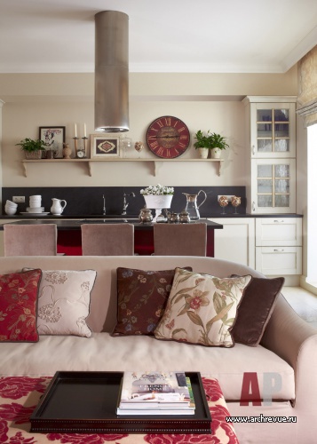 Текстиль выдержан в нейтральной теплой цветовой гамме. Яркие ноты в безмятежном интерьере – брусничный кухонный остров и красные подушки.