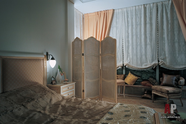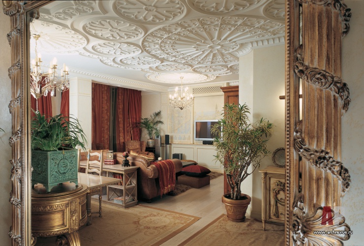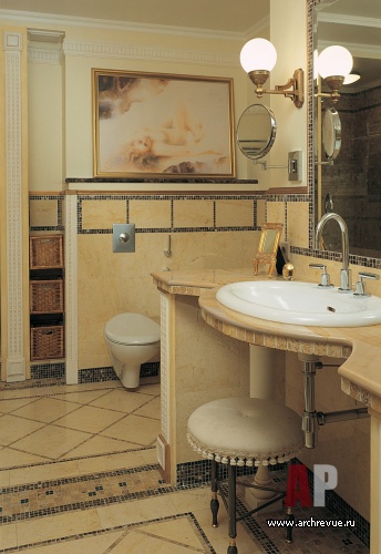 Мокрые зоны облицованы плиткой под камень и мозаикой, имитирующей состаренный мрамор. Восточный колорит в эклектичный интерьер вносит декоративный лепной узор потолков и пышная резьба по дереву в обрамлении зеркал. В них, а также в многочисленных шелковых коврах, читается византийская орнаментика.