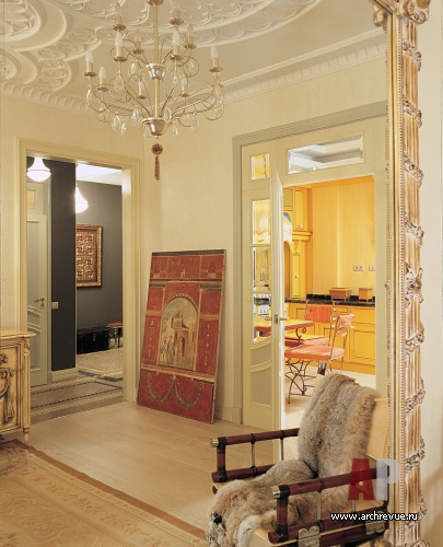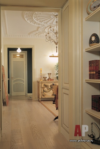 Квартира исполнена в светлой, теплой колористической гамме и украшена авторскими изделиями. Стены декорированы многослойными декоративными штукатурками с едва уловимым деликатным свечением. Полы высланы массивной широкой доской из беленого дуба.