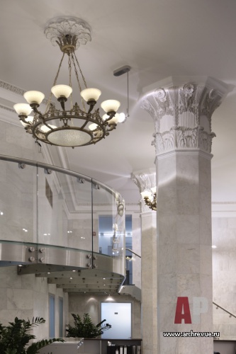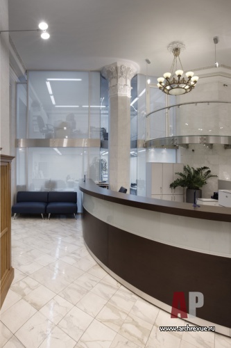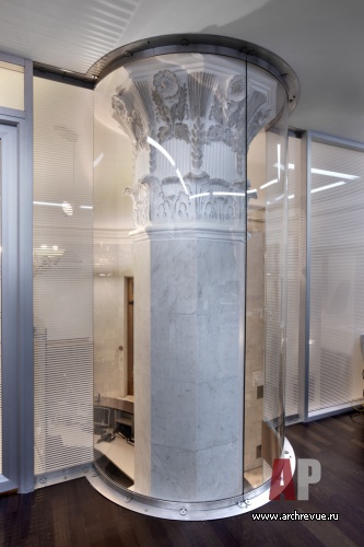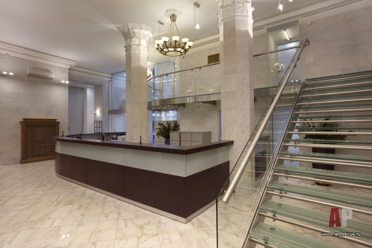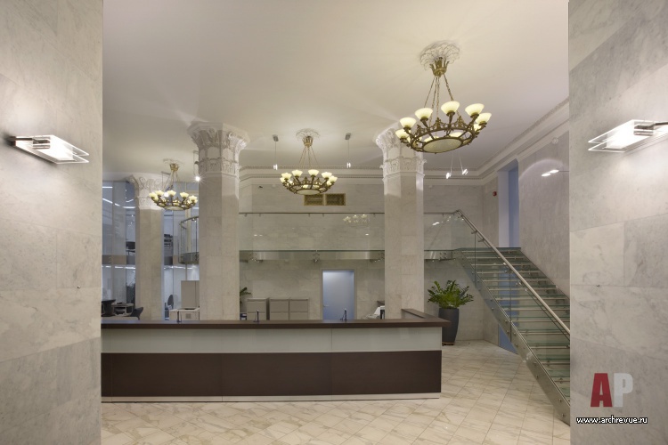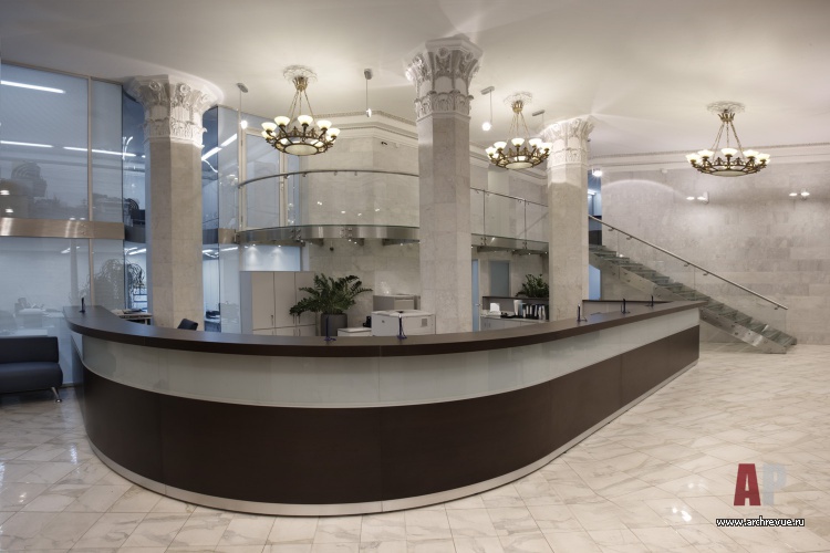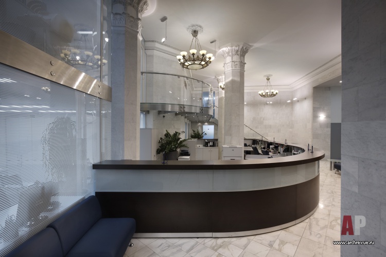 Линия ампира в интерьере поддерживается отреставрированными элементами отделки. Стены приемной и зоны ресепшен, а также мощные несущие колонны облицованы слэбами из белого мрамора с серыми прожилками. Капители колонн и декоративный фриз выполнены из гипса с патиной.