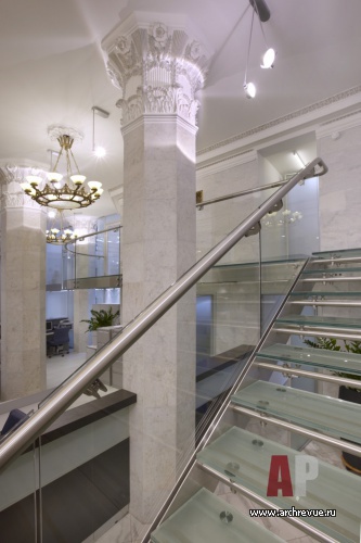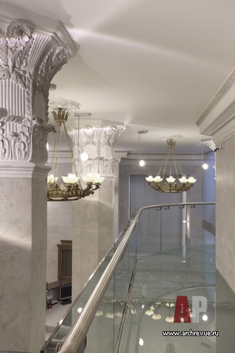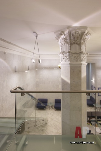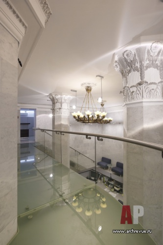 Пространство офиса банка разделено на рабочую и представительскую зоны и организовано на нескольких этажах. Чтобы увеличить площадь помещения, было приято решение надстроить антресоль. Перегородки, ограждения балкона, лестница выполнены из стеклянных конструкций и визуально гармонируют с классическим по духу историческим интерьером.