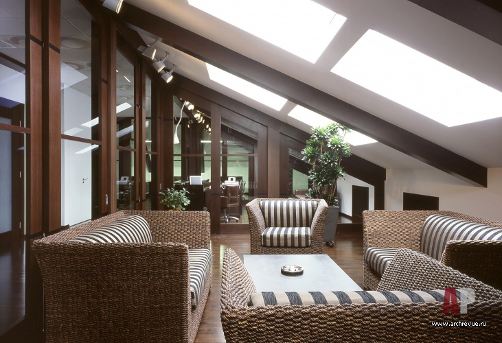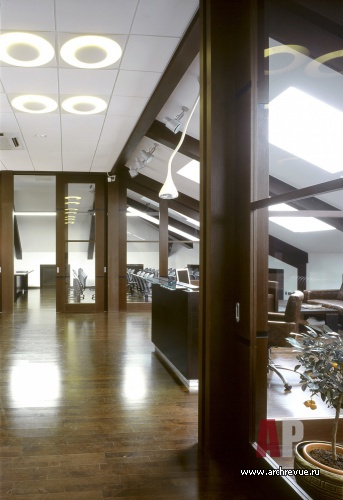 Рабочие зоны организованы по принципу open-space, представительский этаж руководства включает в себя кабинеты, переговорные и зону отдыха с зимним садом и прекрасным видом на город.