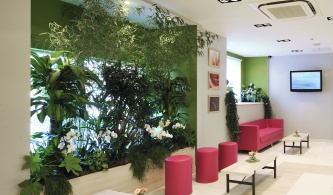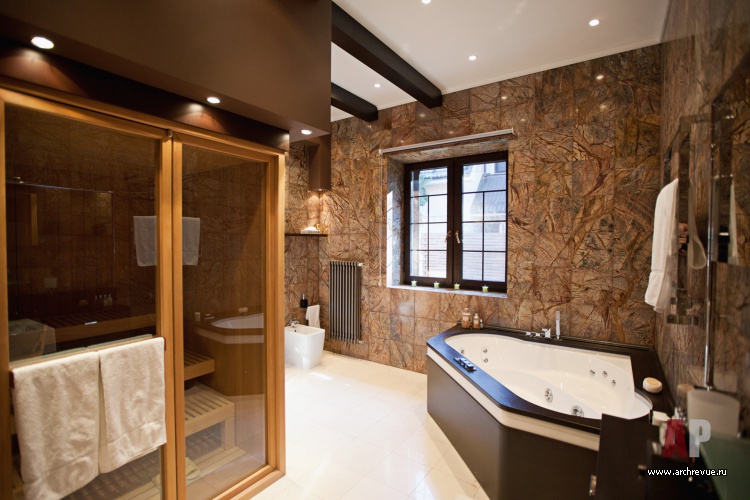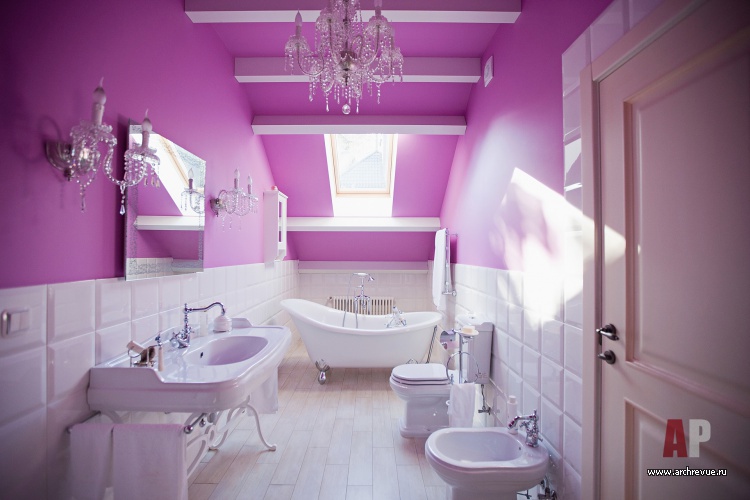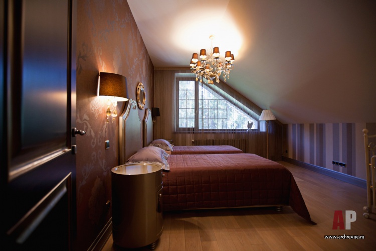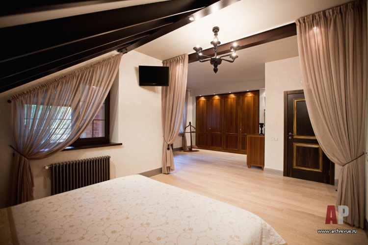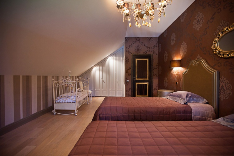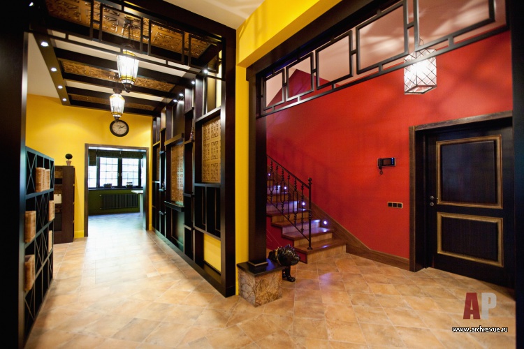 Стены гостевых помещений выкрашены в активные цвета: брусничный, горчичный, желтый, травяной. Визуальная домината первого этажа – перегородка из шпона венге, которая вместе с потолочными балками, навесными панно и встроенным стеллажом с лазерной резкой составляет единое целое. Деревянные изделия, двери, встроенная и корпусная мебель выполнены на заказ на российском производстве по эскизам дизайнера.