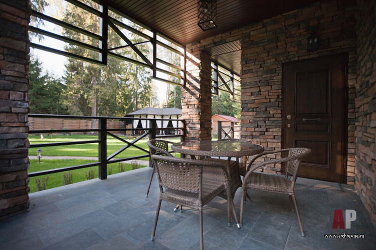 Проект трехэтажного дома разработан с учетом пожеланий семьи с тремя детьми, которая хотела уютный и просторный дом для временного проживания. Фасад высокого статного здания со скошенной кровлей облицован диким камнем, часть внешних стен оштукатурена и покрашена в белый цвет, балкон второго этажа решен в ярком красном цвете.