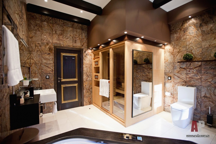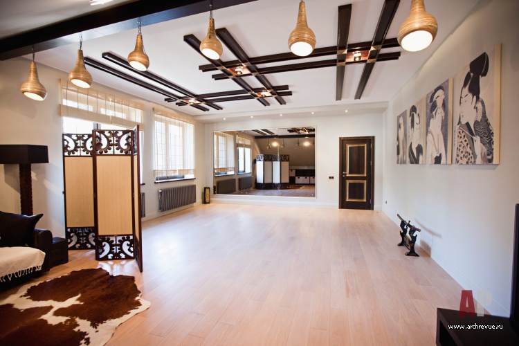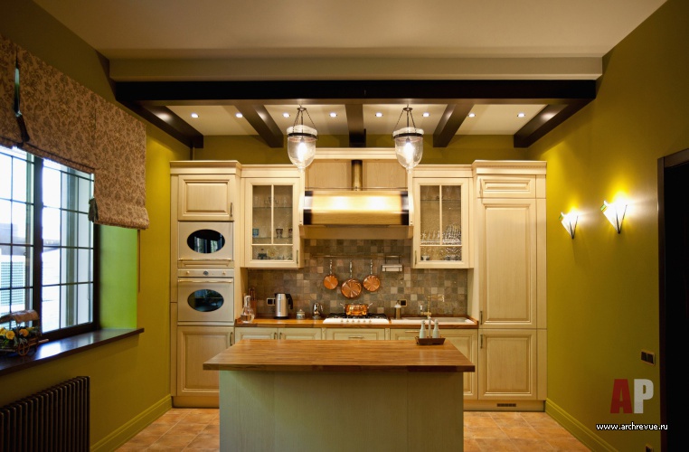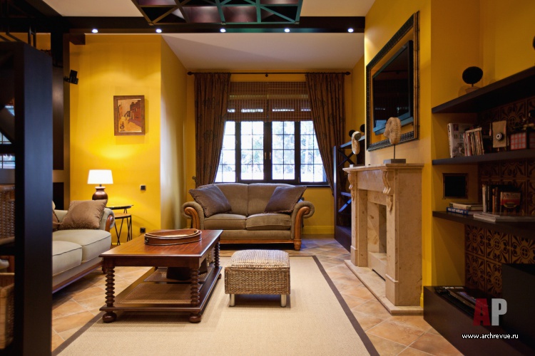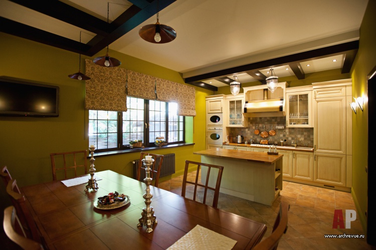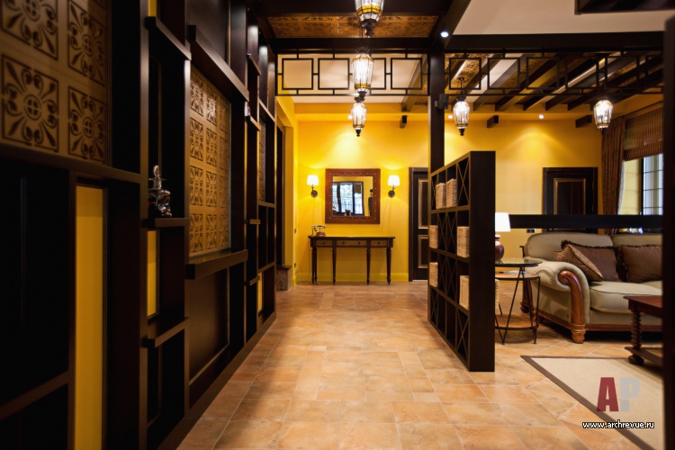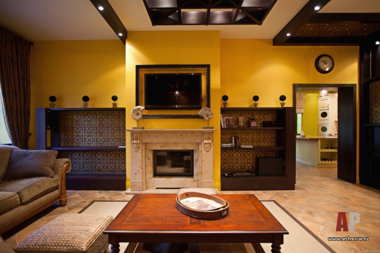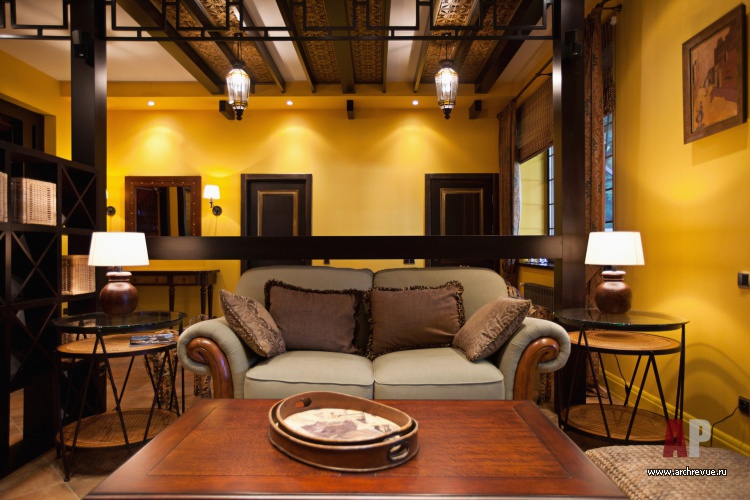 Сочная цветовая гамма, авторские деревянные изделия, мебель индивидуального изготовления и этнические предметы стали основой интерьерного решения дома. Полы гостиной и кухни выстланы испанской керамической плиткой, имитирующей клинкер. Жилые зоны декорированы массивной доской из дуба или ясеня с серебрением и патиной.