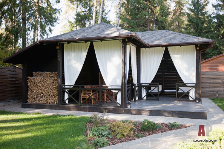 Помимо дома на участке находится деревянная беседка с зоной отдыха.