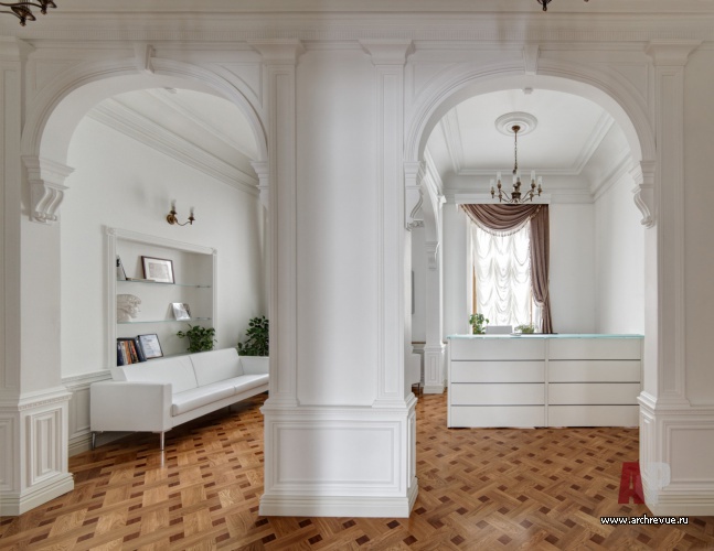 На месте демонтируемых перегородок было решено оставить три арки, которые соотносятся с неоклассической стилисткой здания и зрительно делят помещение на входную зону, зону стойки администратора и мягкую зону. Через коридор приемная сообщается с кабинетами и залами для переговоров.