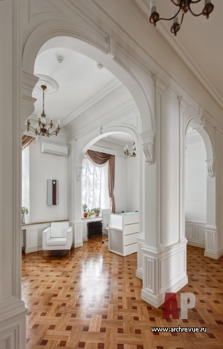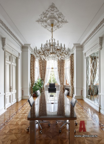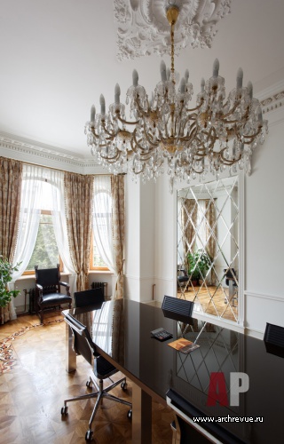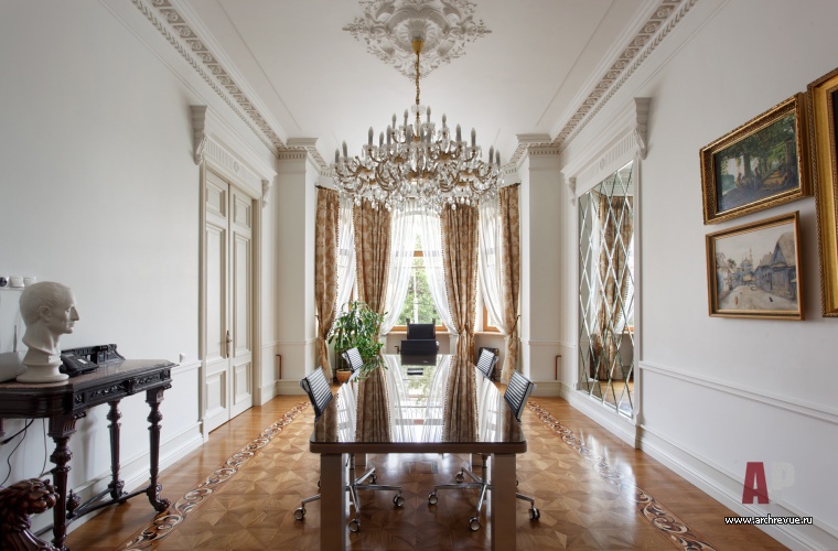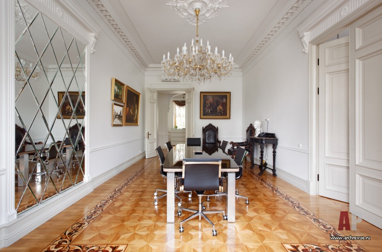 Офис исполнен в парадной стилистике неоклассики с элементами неоренессанса. Парадный настрой формирует сдержанная цветовая гамма: стены, двери, плинтуса и лепной декор из гипса выкрашены в белоснежный цвет. На полах – модульный паркет-«плетенка» из натурального дуб со вставками ироко и декоративными бордюрами с использованием сукупиры, ореха, карельской березы, мербау, клена и венге.