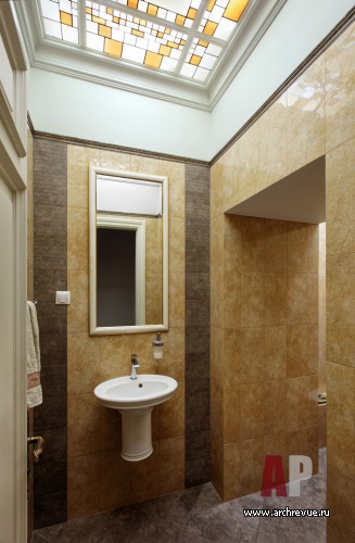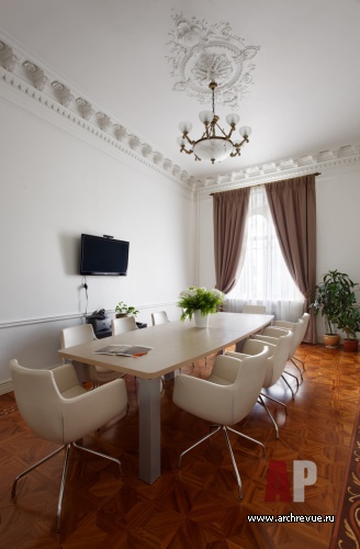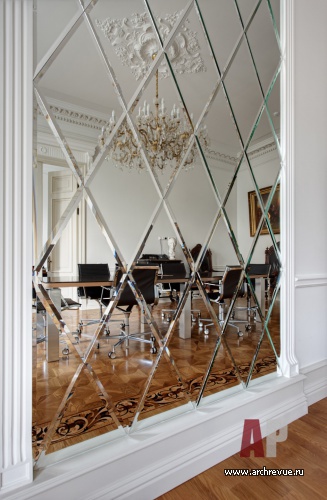 В приемной и главной перегороворной комнате была восстановлена гипсовая лепнина и центральная лепная розетка. Расположение дверей в одной из переговорных было ассиметричным и для восстановления равновесия напротив двери в соседнее помещение архитекторы сделали имитацию дверного проема и выложили его зеркальными ромбами. В итоге получился светлый, цельный и несколько аскетичный интерьер, не перегруженный деталями.