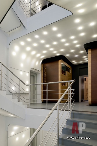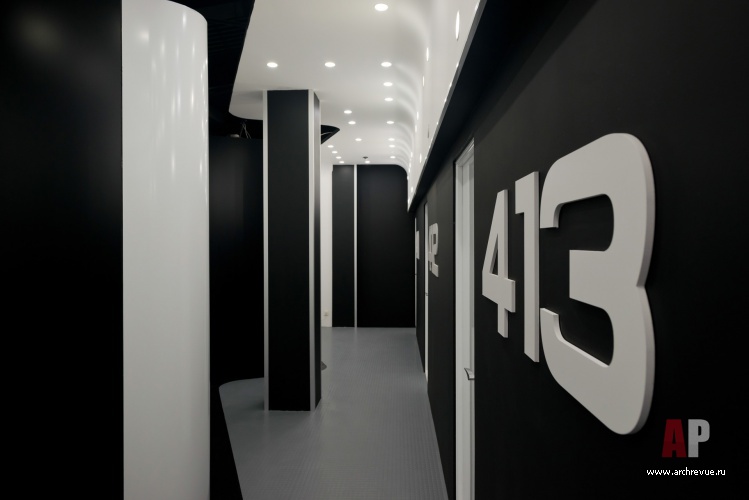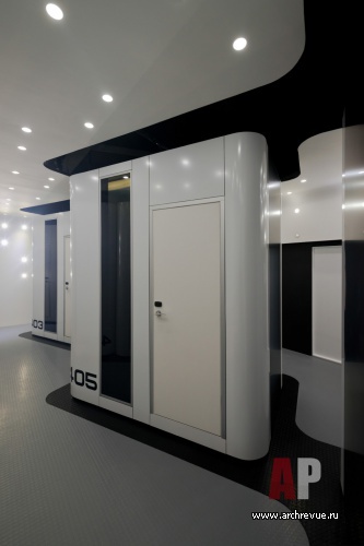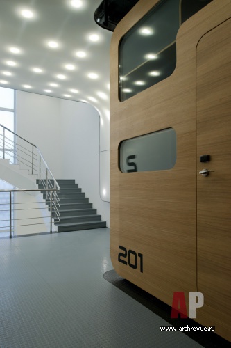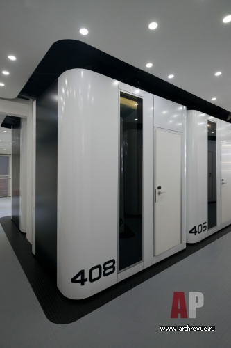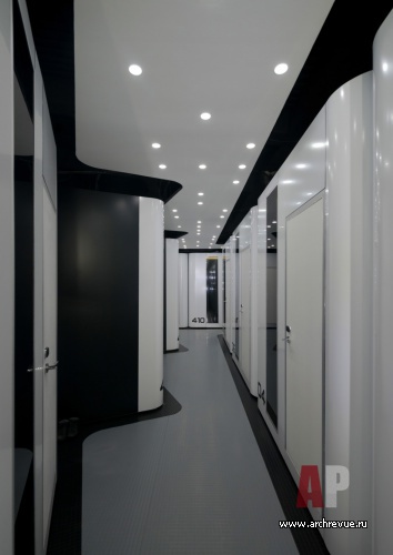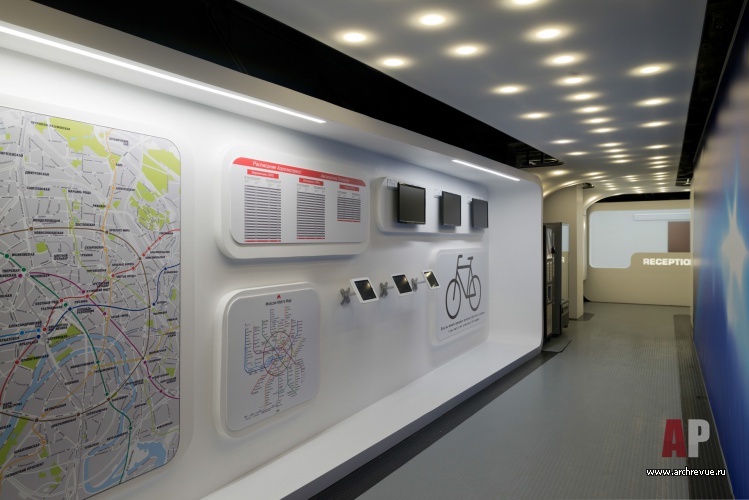 Ощущение цельного пространства создает элемент, который одновременно является светильником и отделкой стен и потолка, как бы перетекая между боксами с потолка на стены. Он выполнен из натяжного светопрозрачного полотна, за которым размещены точечные светодиодные светильники. Модульный номер представляет собой небольшое мобильное помещение (бокс) размером 2,5 Х 1,6 метра в плане и высотой от 2,5 до 3-х метров.