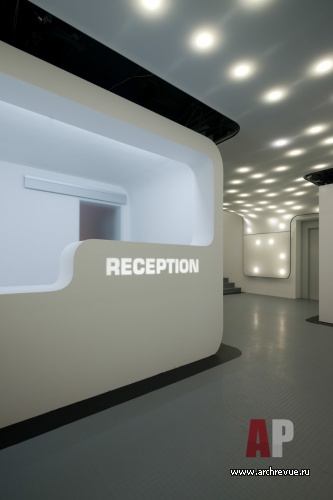 Интерьеры отеля исполнены в современной, футуристической стилистике. Зона ренсепшен выполнена из бесшовного белоснежного кориана. Пол выстлан каучуковым покрытием. Рисунок пола повторяет рисунок потолка, поэтому каждая группа боксов визуально отделена от стен и пола черной зоной, что подчеркивает дизайн боксов и позволяет совместить деревянную фактуру с общим монохромным фоном.
