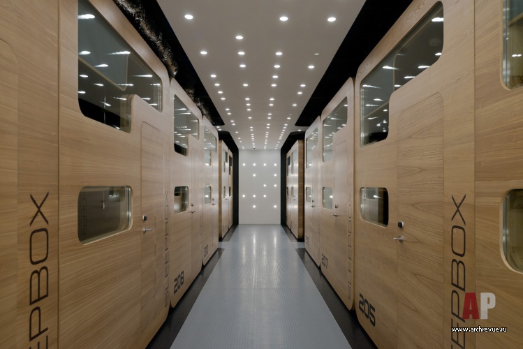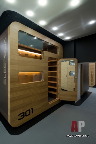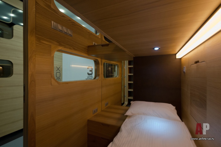 Отель занимает четыре этажа здания. На первом этаже размещается зона ресепшн, информационная зона, зона ожидания, индивидуальные шкафчики для жильцов и администрация. Двухместные Sleepbox-капсулы с деревянной фактурой занимают второй и третий этажи, а на четвертом этаже расположены одноместные боксы в черно-белом исполнении.