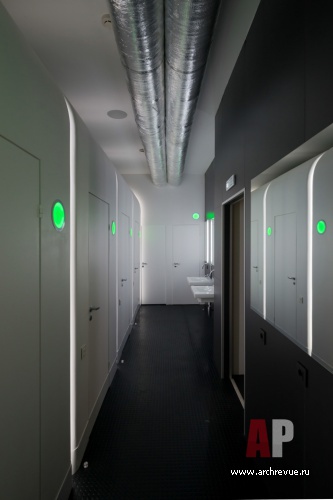 Санузлы выглядят как отдельные капсулы, выставленные в ряд. Стыки между ними подсвечены светодиодами. На каждой есть большой круглый светящийся индикатор занятости, который горит зеленым, если кабина свободна или красным, если занята.