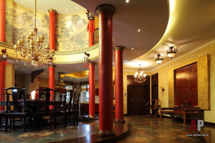 Стены в зале декорированы сусальным золотом и росписью в духе классических китайских гравюр. Кованое ограждение балкона второго этажа отсылает к классически образцам китайской орнаментики. Полы в столовой и кухне выстланы плитами натурального сланца, в гостиной и приватных помещениях – штучным паркетом или доской из палисандра. Интерьер оформлен китайской антикварной мебелью и настенными фонарями, а также статуэтками из нефрита и оникса.