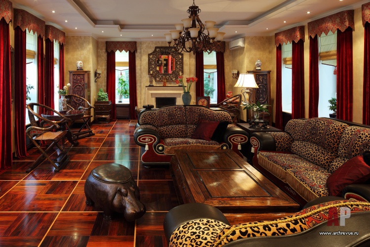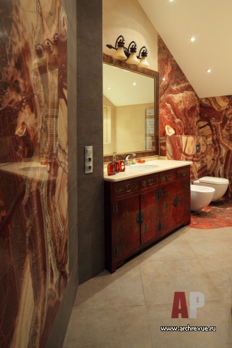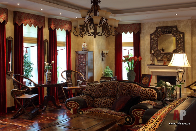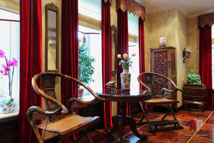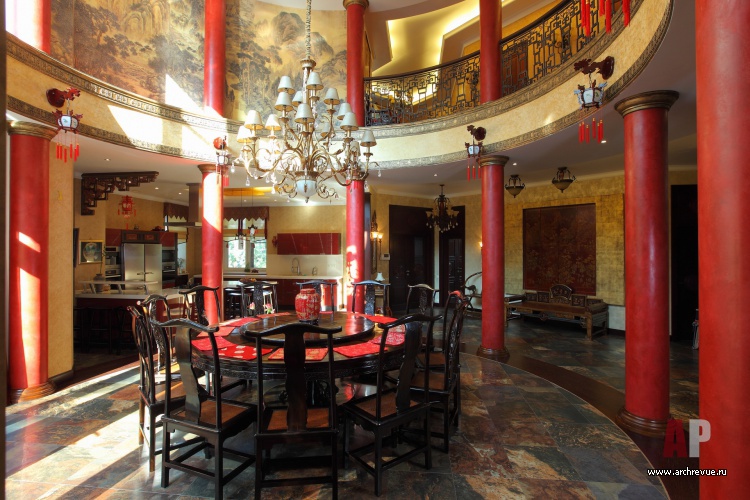 Интерьер дома выполнен в традиционной китайской эстетике с элементами колониального стиля. В отделке использованы исключительно натуральные материалы с редкой и ценной фактурой. Круглую столовую украшает ярко-красная колоннада, которую можно увидеть в китайских пагодах или буддистских храмах.