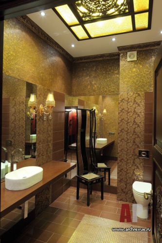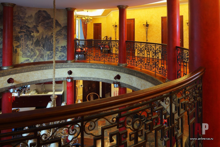 Центральную часть дома занимает круглый двухуровневый зал с панорамным остеклением, красными клонами, росписями, золочением и кованым ограждением холла второго этажа. Здесь расположена парадная столовая. К ней примыкает кухня и гостиная с мягкой зоной и камином, решенные в едином объеме, без перегородок.