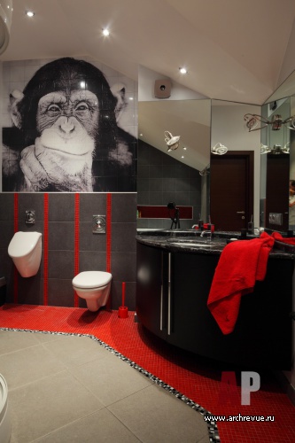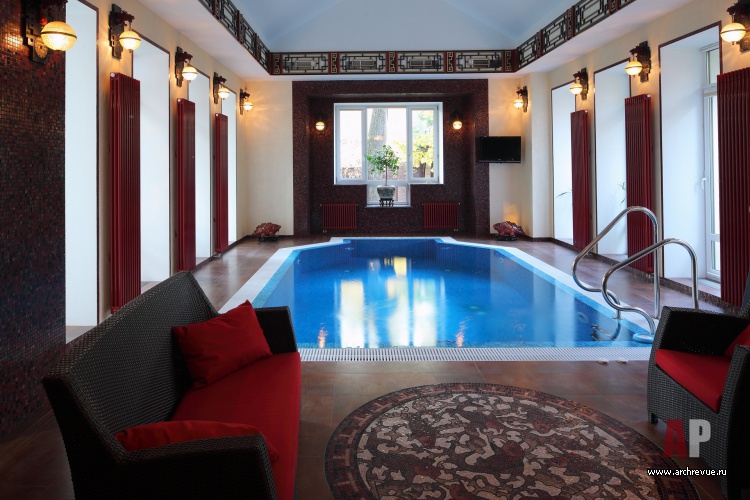 На втором этаже находятся приватные помещения хозяев дома: спальня, детская, гостевая, бильярдная и сопровождающие помещения. Отдельным блоком спроектирован бассейн с сауной и душевой.