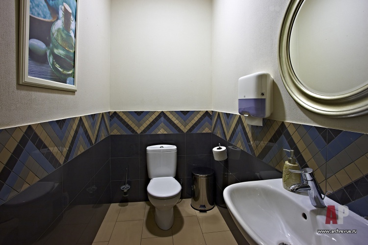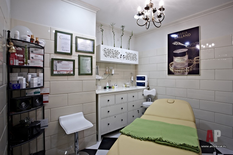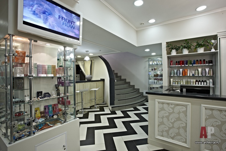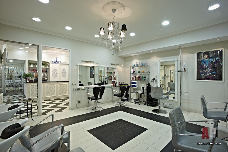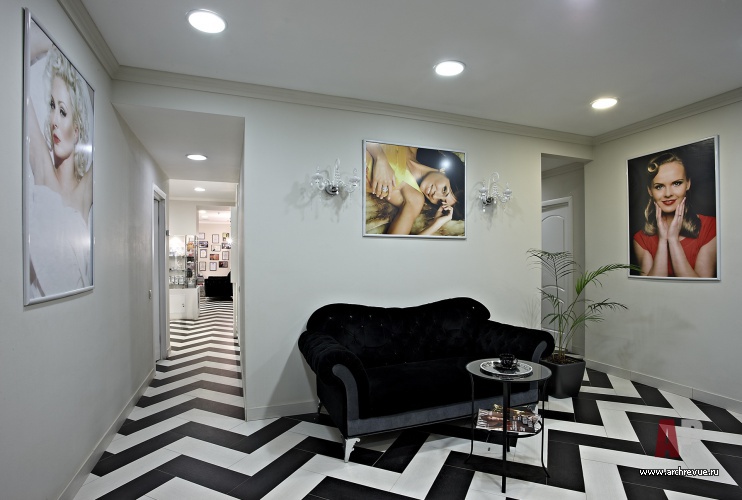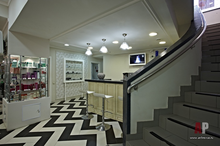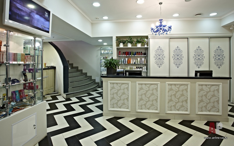Едва ли не главную роль в облике интерьера салона красоты играет пол. Активный, зигзагообразный рисунок пола из черно-белого керамогранита берет на себя максимум внимания. Стойка ресепшн, встроенные шкафы за ней и барная стойка обшиты светлым деревом, расписанным орнаментом в стиле Прованс.