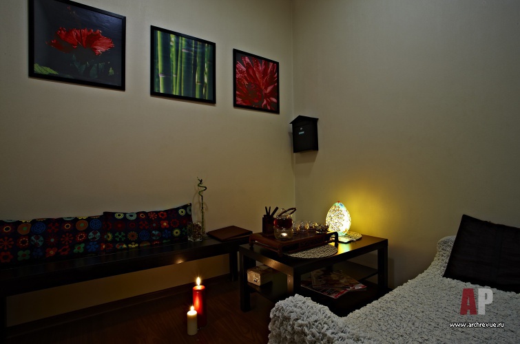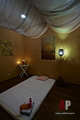 С деревянным декором сочетаются декоративные вставки, выполненные с использованием бумажных обоев с рисунком «турецкий огурец». Процедурные кабинеты оформлены в теплой цветовой гамме, с использованием приятного на ощупь текстиля, и выглядят уютными.
