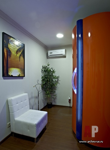 Из общей зоны можно попасть в парикмахерский зал на 7 рабочих мест, кабинеты для массажа, кабинеты для косметологии по лицу и телу, маникюрный салон, солярий. Гордость салона – фиш-спа с большой ванной, облицованной по периметру тиковой доской.