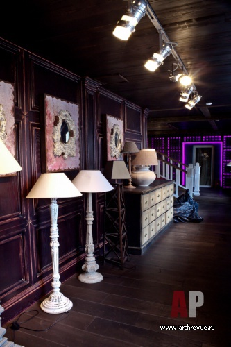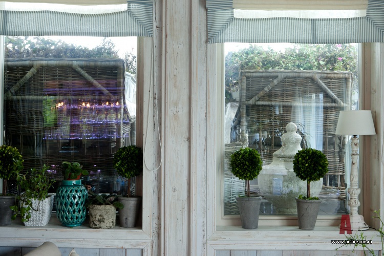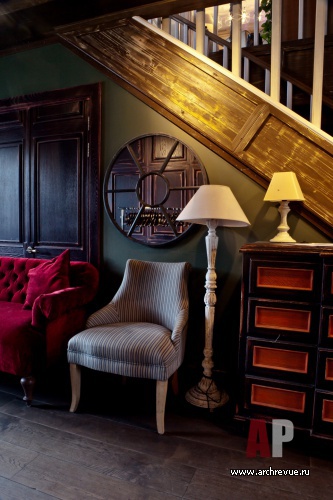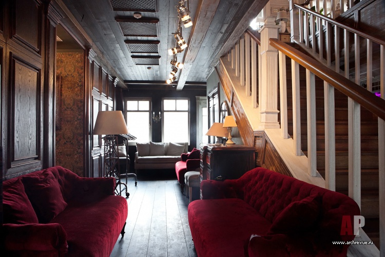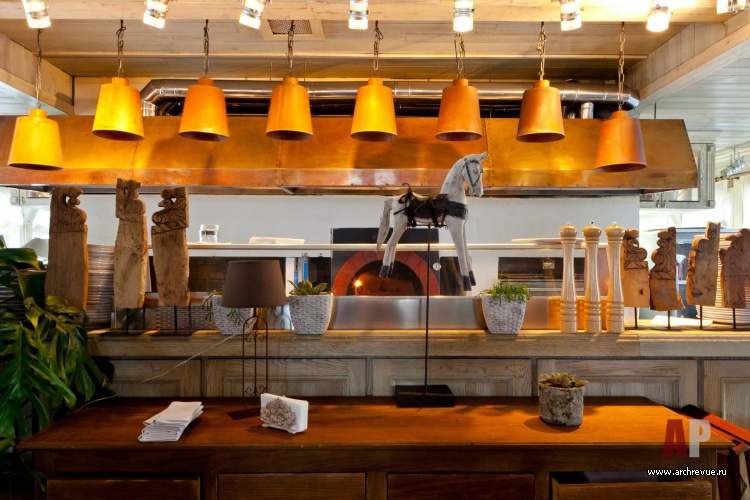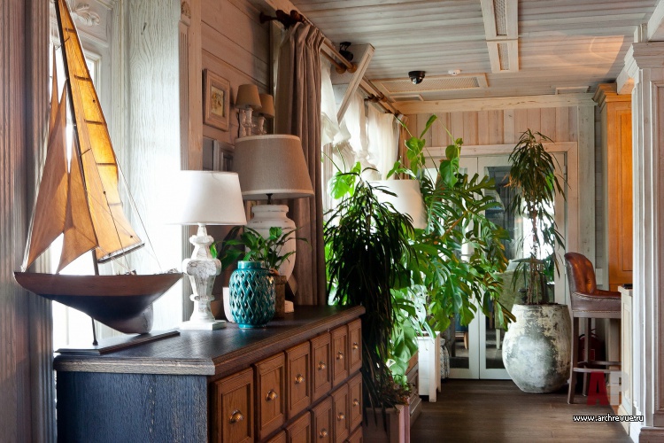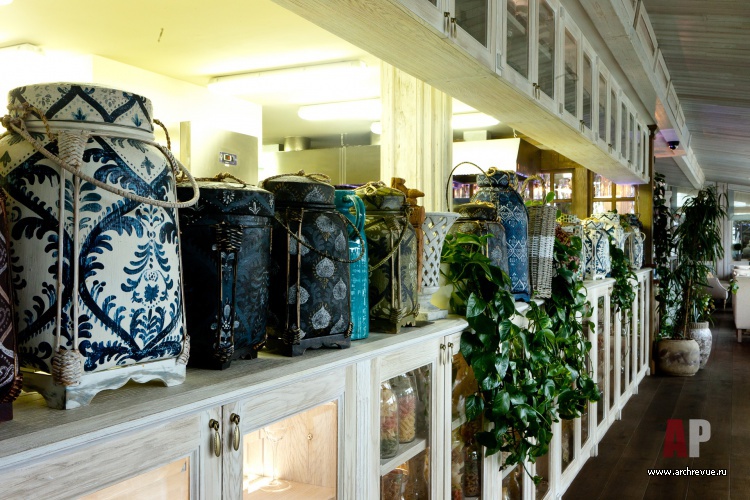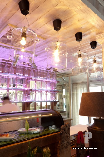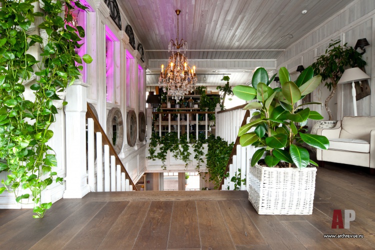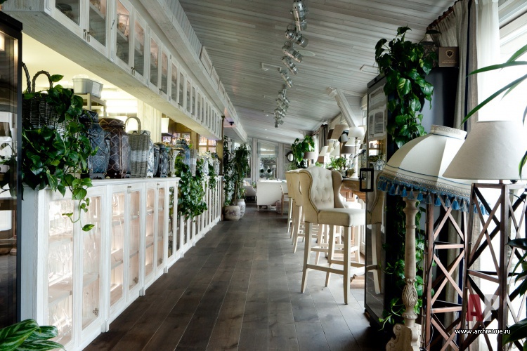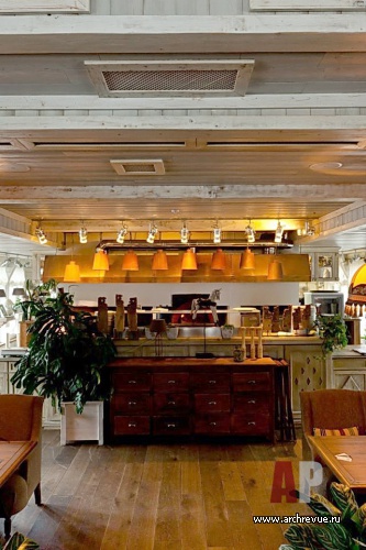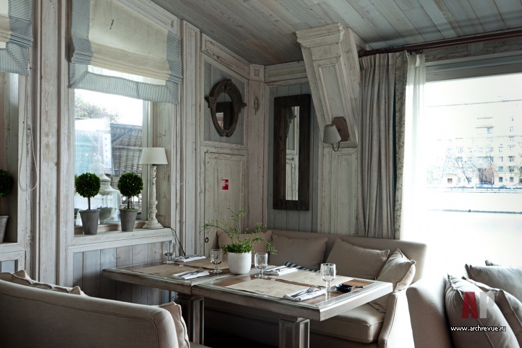 Интерьеры ресторана оформлены в духе загородного дома в стиле Прованс. Стены и потолки зашиты натуральной старой сосной, в свое время она украшала деревянные дома русской и европейской знати. Глубокие диваны обиты белым льном, столы из ореха, изъеденного жучком, зеркала в резных деревянных рамах, торшеры с абажурами из ткани, многочисленные вазочки, баночки, керамические горшочки - все это работает на атмосферу загородного отдыха и релакса.