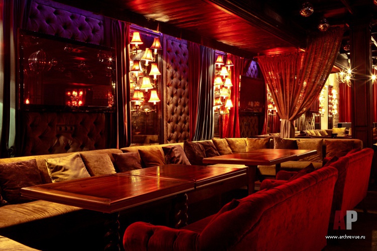 Зона караоке на нижней палубе решена в плотных, насыщенных тонах с преобладанием винных оттенков.