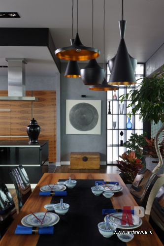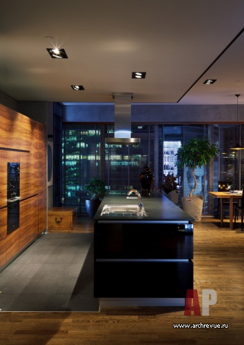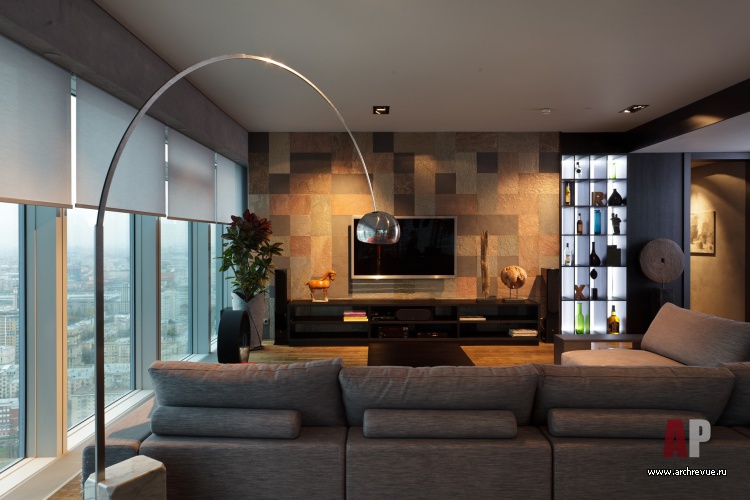 Заказчики мечтали об уютном загородном доме, а парящая над городом квартира на 40-м этаже с панорамными окнами изначально имела холодные офисные интерьеры. Чтобы примирить землю и воздух, уют и открытость, дизайнер предложила привнести цветовую гамму земли и использовала природный сланец красно-коричневого оттенка, декоративную штукатурку, имитирующую бетон, дерево с живой фактурой.