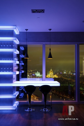 Гостиная диван Estetica, поставщик Estetica; барная стойка – индивидуальное изготовление из светопрозрачного искусственного камня Corian, производитель DuPont, поставщик Acrillon; стеллажи с подсветкой, на заказ, по эскизам дизайнера, изготовление «КД-Люкс »