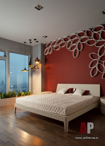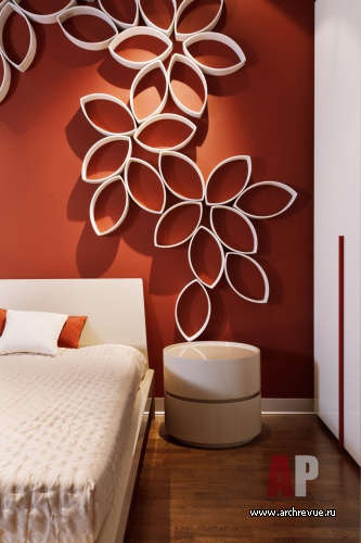«При оформлении хозяйской спальни я вдохновлялась искусством оригами. На глаза попалась картинка, где из бумаги была выклеена композиция из лепестков. И я решили этот прием использовать в оформлении плоскости стены, только вместо бумаги взяла дерево. Производители из Челябинска, которые специализируются на изготовлении деревянных изделий по 3D-моделям, сделали комплект лепестков, толщина стенки каждого из которых 5 мм. Они выглядят, как бумажные…»