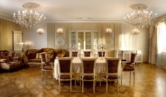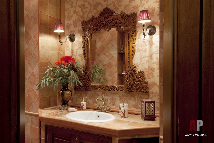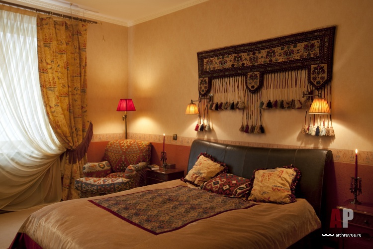 Важную роль в интерьере играет текстиль, живопись и богато орнаментированные восточные панно из резного дерева.