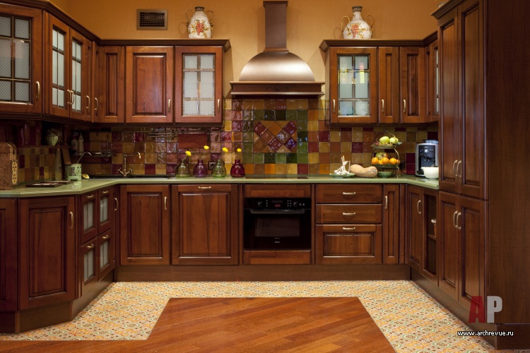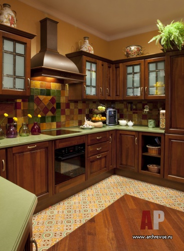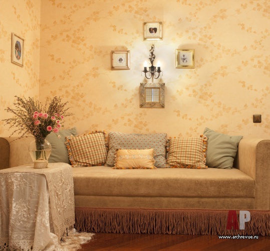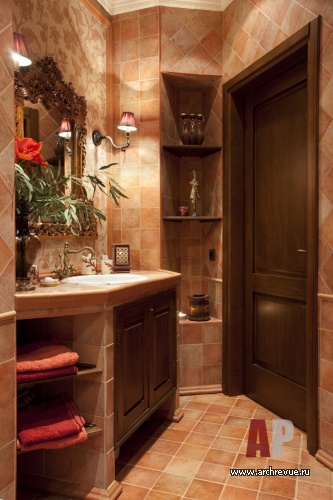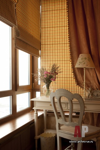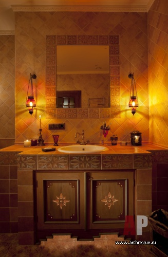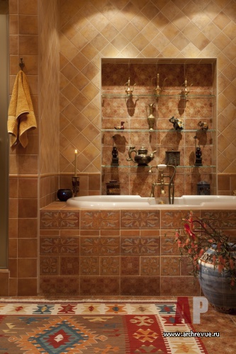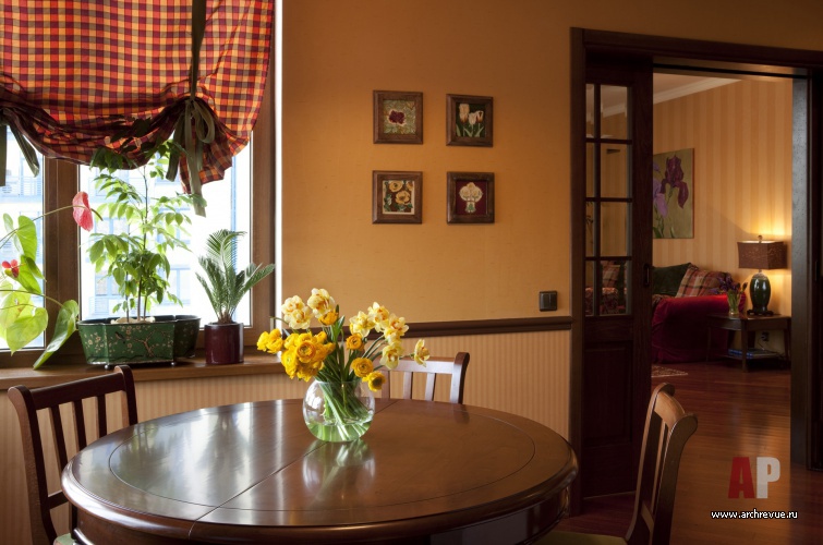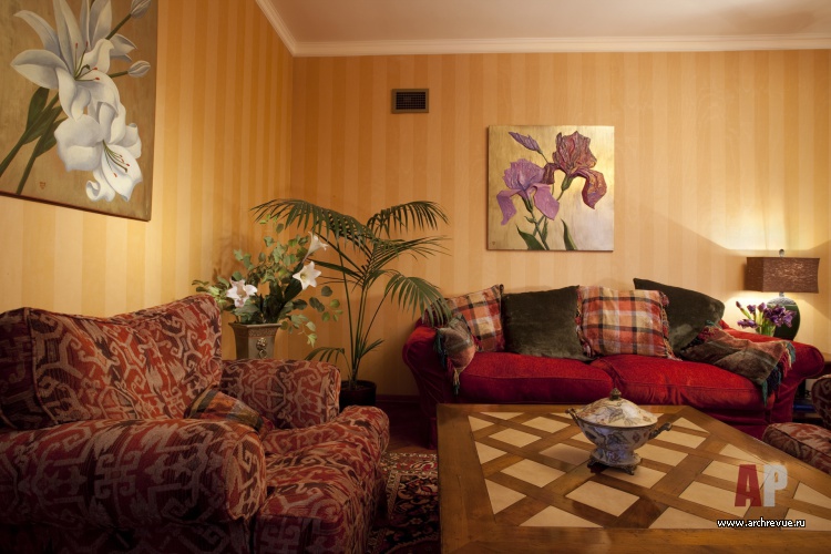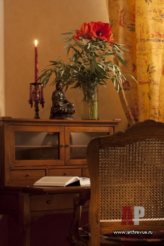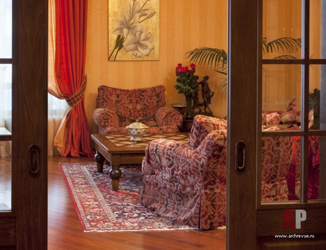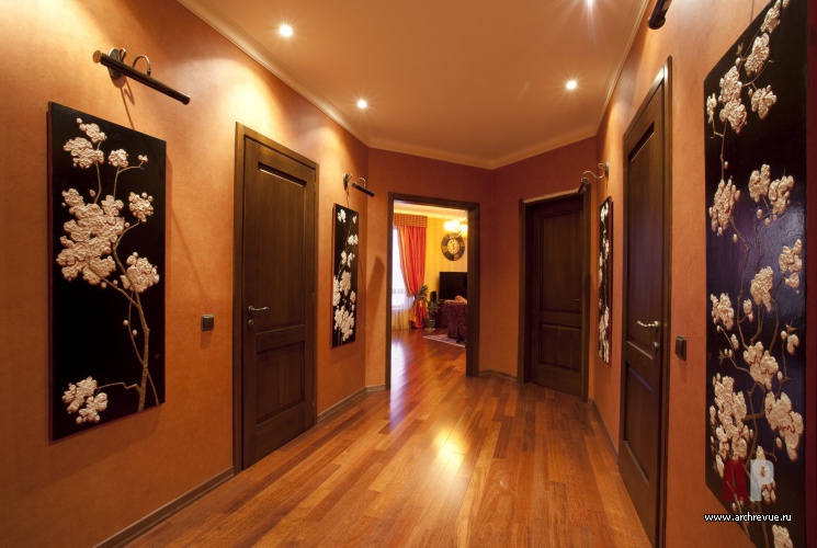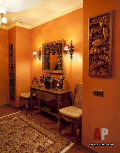 В интерьере квартиры преобладает восточная тематика. Цветовая палитра построена на терракотовых, бежевых и красных тонах. Полы в жилых помещениях выстланы дубовой половой доской, мокрые зоны оформлены колоритной восточной керамикой. Двери и порталы дверей выполнены из тонированного дуба; раздвижные перегородки со стеклянными вставками убираются в стену.