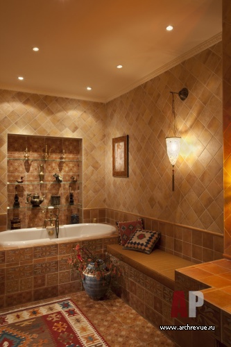 Квартира для семьи выполнена в эклектичном стиле с восточными мотивами. Помимо уютной гостевой зоны и комфортных приватных комнат архитектору следовало создать SPA-комплекс на дому. Большая банная зона способствует отдыху и релаксу.