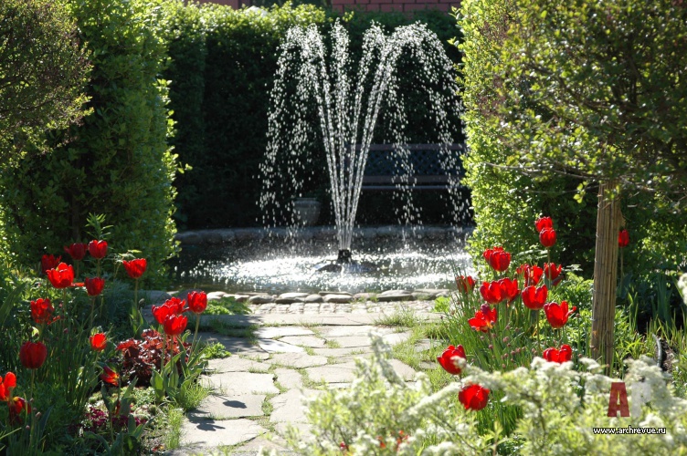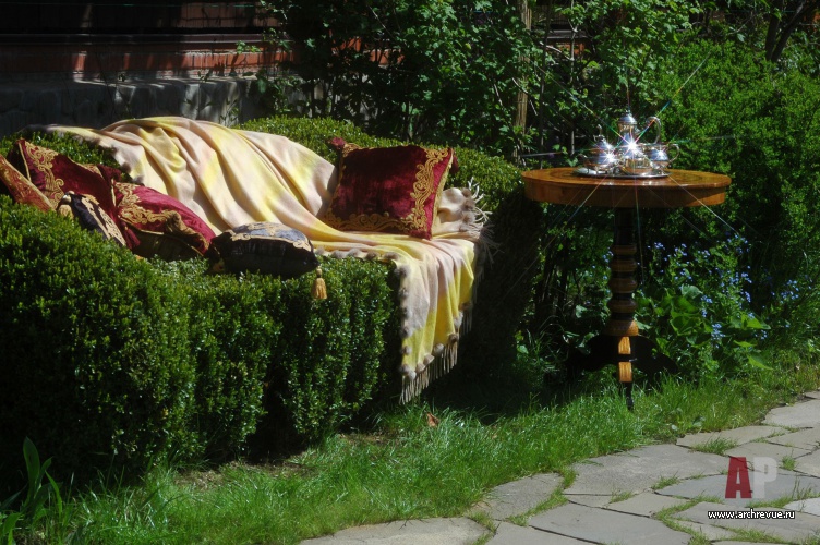 Расположенные по углам участка каштаны логически завершают рисунок изгороди, придавая композиции законченный вид. А разнообразные классические детали - аллеи, арки, бельведер, берсо, фонтан - создают атмосферу регулярности. Уникальный посадочный материал из лучших европейских питомников позволил за год сделать сад, которому уже сегодня на вид не менее полусотни лет.