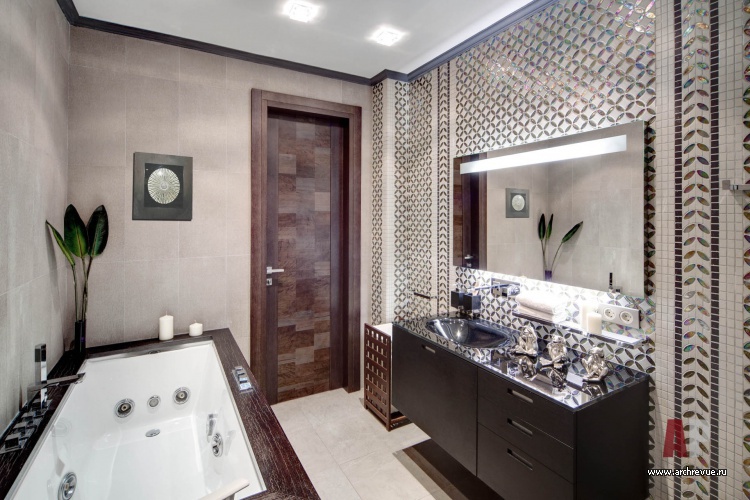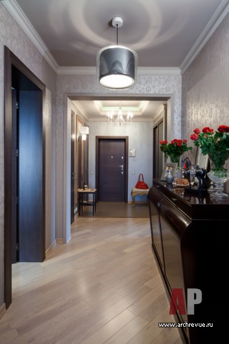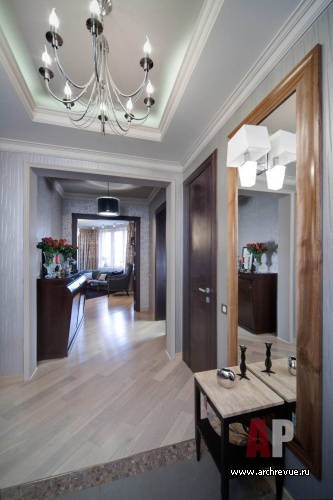 Квартира решена в стилистике мягкого минимализма. В оформлении использованы натуральные материалы с живой фактурой: массивная половая доска из выбеленного дуба, сланец, мраморная плитка. Двери, порталы, плинтуса выполнены из темного, тонированного дуба. С геометричным рисунком полотен дверей рифмуется настенно панно с абстрактным рисунком из дерева.