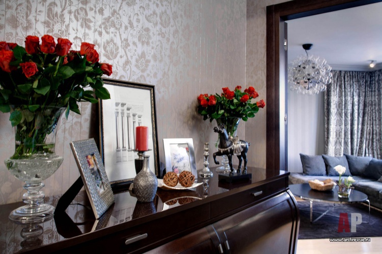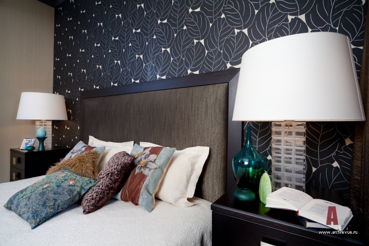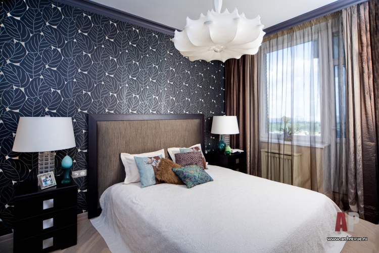 Важную роль в создании облика квартиры имеют обои. В гостиной выбраны строгие обои в полоску пастельных цветов, на кухне – обои, имитирующие фактуру песчаника, в холле – серебристые обои с цветочным орнаментом, визуально раздвигающие пространство. В более ярком ключе оформлена спальня: она декорирована черно-белыми обоями Osborne&Little с изображением листьев, которые прекрасно сочетаются с центральным модернистским светильником.