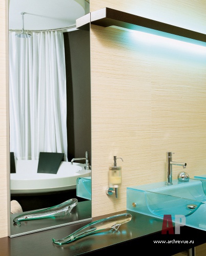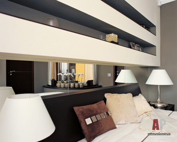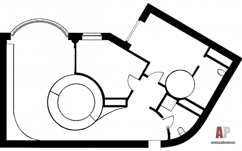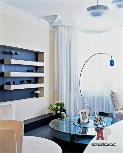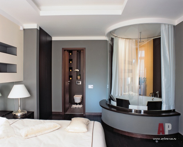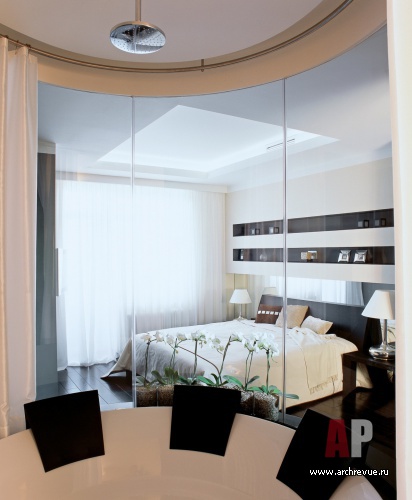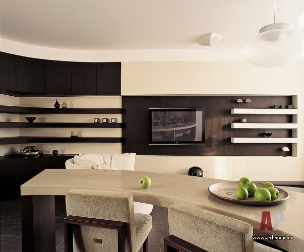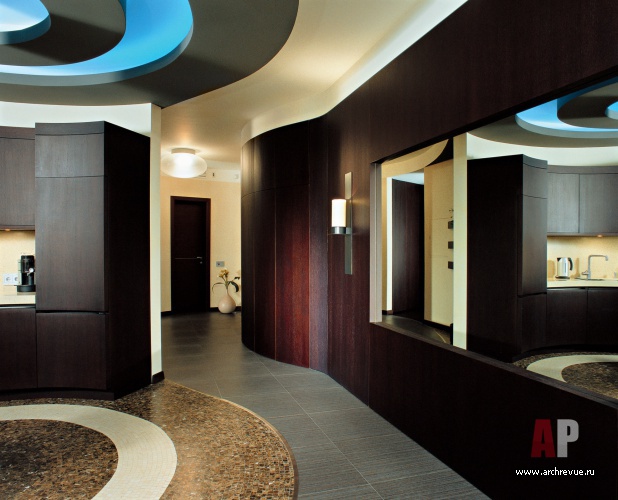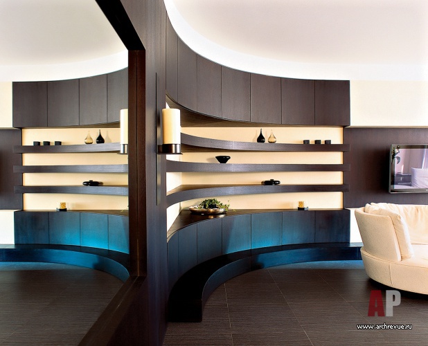 Чтобы акцентировать пространственные круги, в декоре применяется гнутое стекло и радиусные деревянные панели. Особого внимание заслуживает высокое качество исполнения индивидуальных элементов декора: встроенных шкафов, стеллажей, мозаичных панно, радиусной барной стойки из кориана.