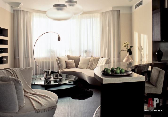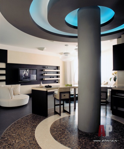 В основе композиционного решения пространства квартиры – правильная форма круга, текучие линии, дуги и пластичные объемы. Открытая планировка позволила совместить зоны гостиной, столовой и кухни в едином помещении. Их зонирует круглая несущая колонна, превращенная в мощный декоративный ход.