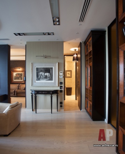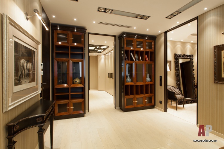 Квартира имеет традиционную планировку. Согласно классическим канонам, помимо прихожей в ней есть парадный холл и коридор – просторное помещение правильных пропорций. Оно служит своего рода буфером между входной зоной, общественными помещения и приватными апартаментами.