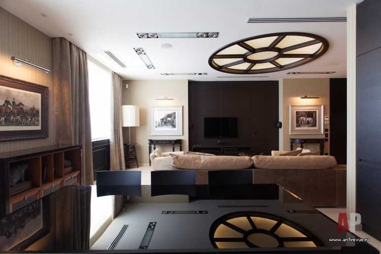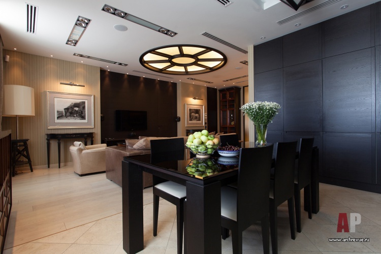 Прямо от входа находится объединенная зона гостиной, столовой и кухни. За раздвижными дверями, составляющими единую композицию с отделкой домашнего кинотеатра, находится кабинет. В глубине квартиры изолированные от гостевого блока коридором находятся спальни – хозяйская со своей ванной комнатой и детская. Характерный прием зонирования пространства – раздвижные перегородки и двери из матового стекла. Они позволяют при необходимости изолировать те или иные помещения или, напротив, сделать пространство просторным и перетекающим из зоны в зону.