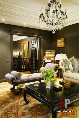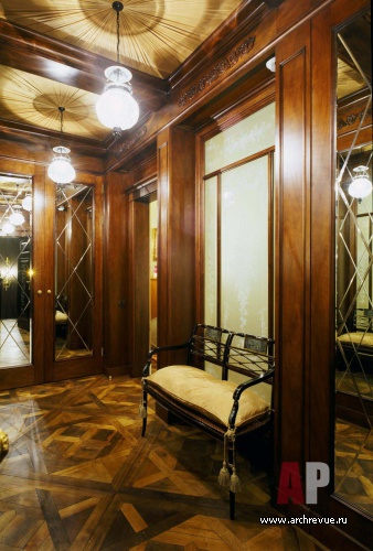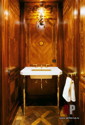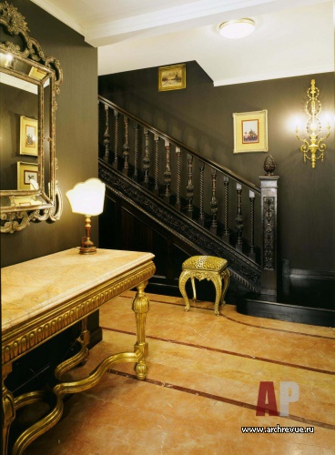 Трудно поверить, что эта подробная, рукотворная и богатая цитатами из классического наследия двухэтажная квартира находится в новом доме в центре Москвы. В ее оформлении декоратор Екатерина Федорченко применяет почти забытые сегодня сложные в исполнении отделки: резьбу и искусное маркетри, панелирование с использованием черного лака, патинирование стен с эффектом состаренного золота.