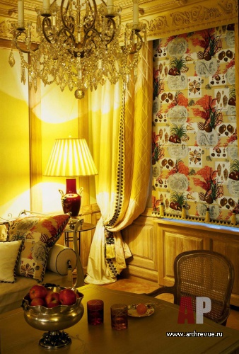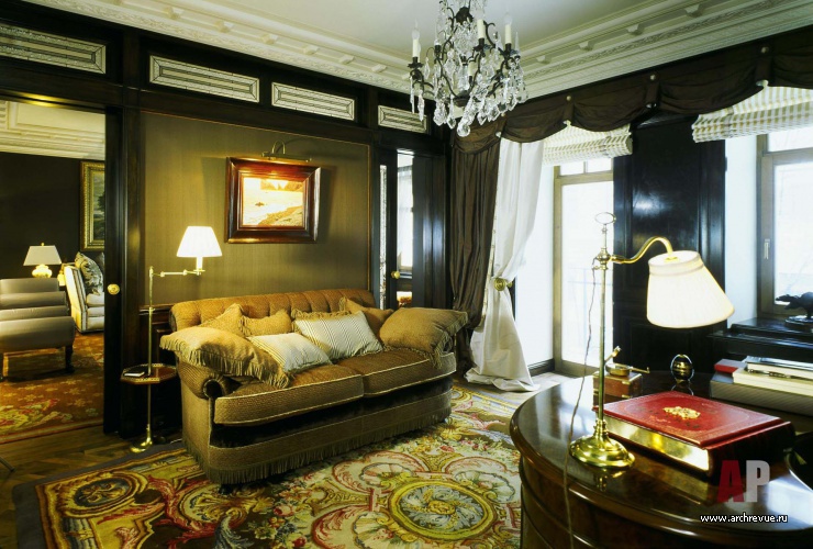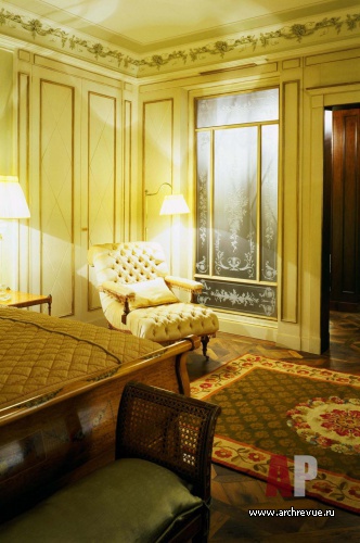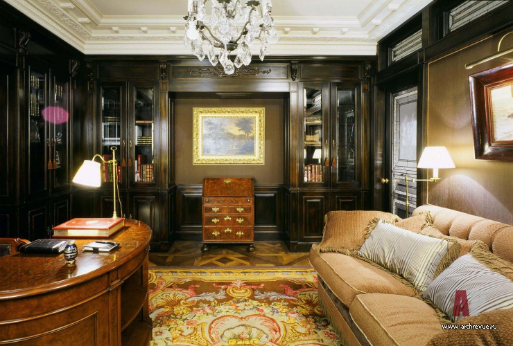 Все помещения выстланы дубовым антикварным паркетом, вывезенным из особняков французской элиты прошлых столетий, заново собранными и отреставрированными. Особое внимание декоратор уделяет финишной отделке авторских деревянных изделий из редких сортов дерева, они созданы по классической технологии XVIII – XIX веков. Гостиную и кабинет отделяют гравированные витражи ручной работы. Стены украшены сложными авторскими покрасками с эффектом состаренного золота. Облик интерьера завершают антикварные предметы, каждый из которых мог бы стать жемчужиной коллекции.