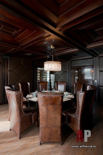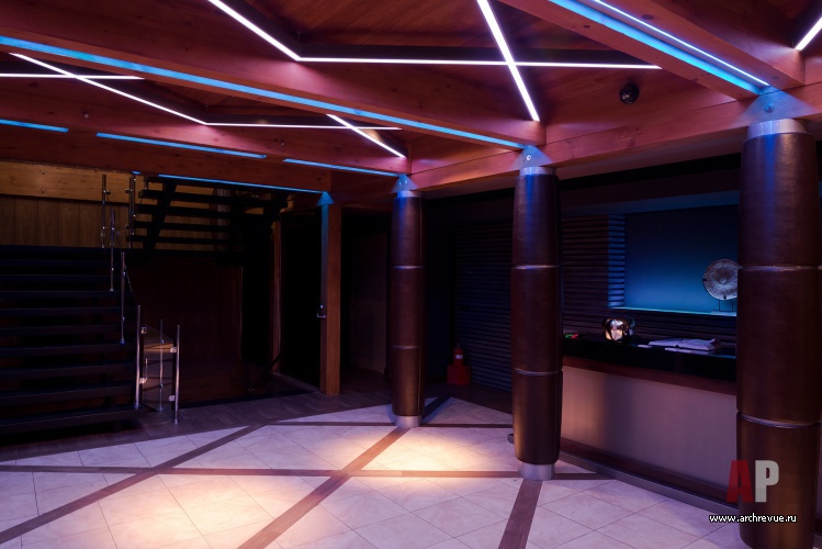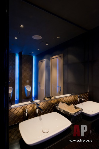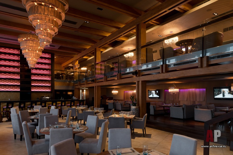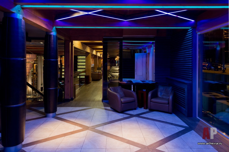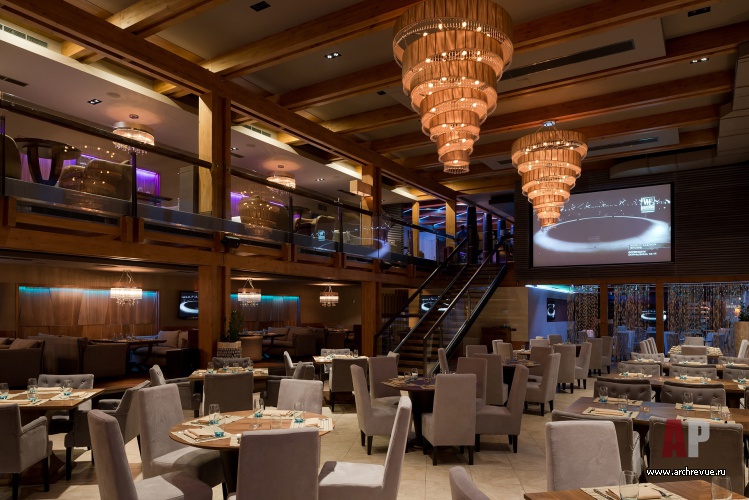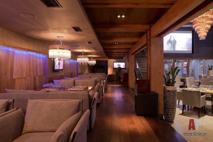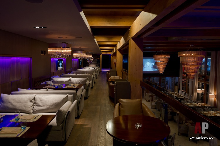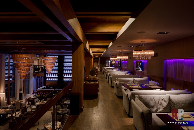 Как модернистское панно выглядит композиция барной стойки с высоким (на всю высоту атриума) стеллажом. Он, как и фасад банной стойки, выполнен из панелей МДФ с эффектом рельефных пазлов, которые сверху покрашены в золотой цвет. Нетривиальная форма отделки бара рифмуется с декоративными люстрами. Помимо декоративной функции, крупные спиралевидные светильники с хрустальными подвесками визуально масштабируют пространство. Облик малых залов и караоке формируют геометрические деревянные панно, дизайнерские обои, кожаные панели. Важную роль в интерьере играет световое оформление. Скрытые неоновые светодинамические подсветки акцентируют архитектурное решение пространства, зонируют ресторан, а также перекликаются с архитектурной подсветкой ночной Москвы.