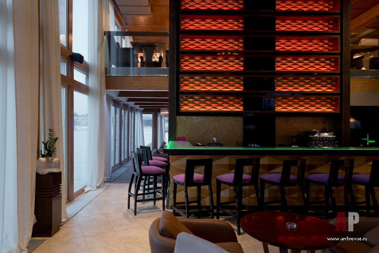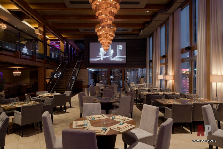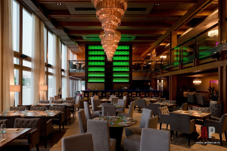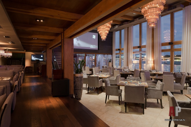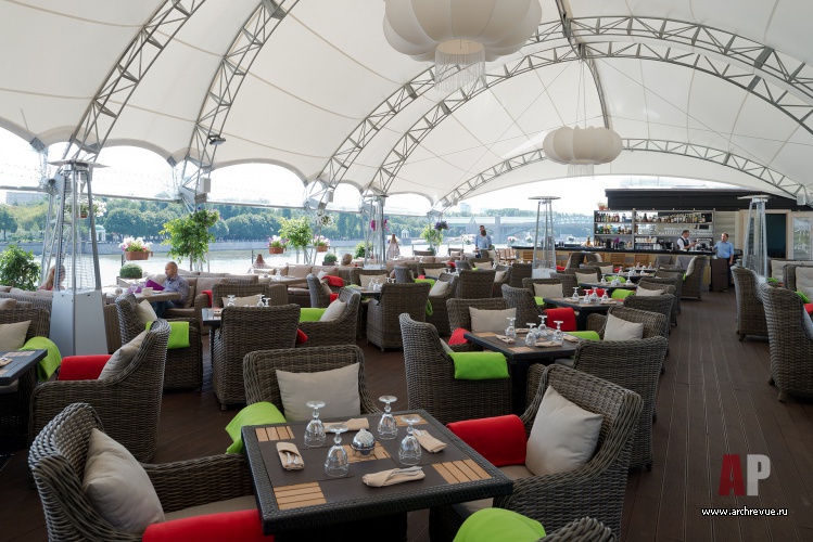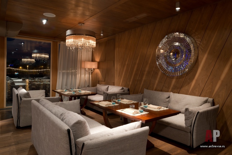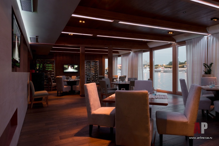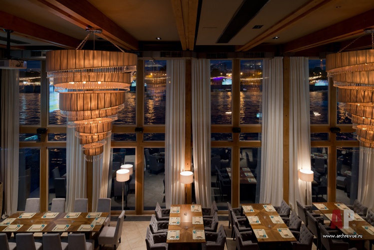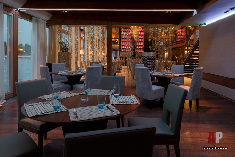 Перед архитекторами бюро «А+А» - Алексеем Вязьминовым, Иваном Сельвинским, Анной Голоуховой, Екатериной Вязьминовой и Светланой Поляковой – стояла задача превратить двухпалубный дебаркадер на Фрунзенской набережной в респектабельный ресторанный комплекс на воде.