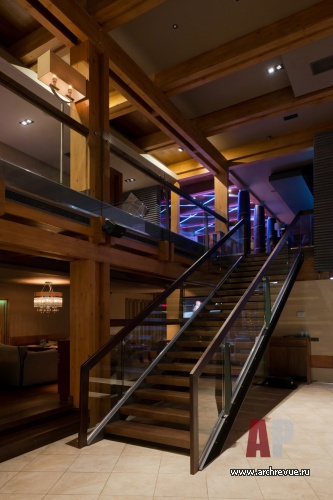 Интерьеры буржуазного ресторана на воде оформлены в спокойном и строгом стиле, продолжая общую конструктивную идею с использованием дерева как основного материала отделки. В большом двухуровневом зале природная фактура дерева сочетается со светлым камнем и прозрачным стеклом, из которого выполнена конструкция лестницы и галереи второго этажа.
