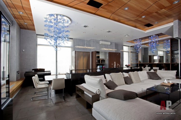 Эта идея хорошо поддержана наличием высоких потолков и больших оконных проемов.