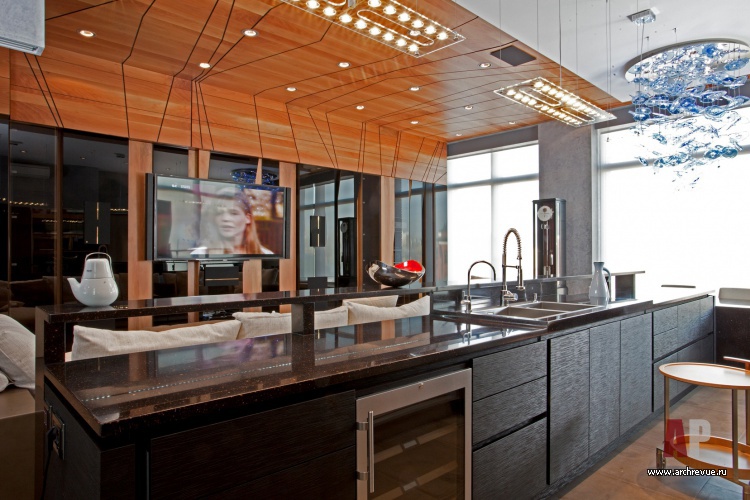 Гостевая часть квартиры решена по принципу студии. Холл, гостиная, столовая и кухня плавно перетекают друг в друга, отчего общий объем выглядит светлым и воздушным. На идею открытости работают стеклянные перегородки, которые отделяют рабочую зону кухни. Приватные помещения максимально изолированы от гостевой части.