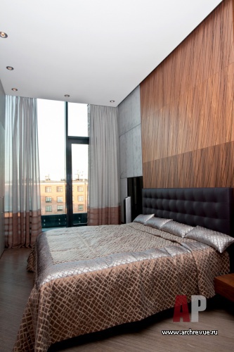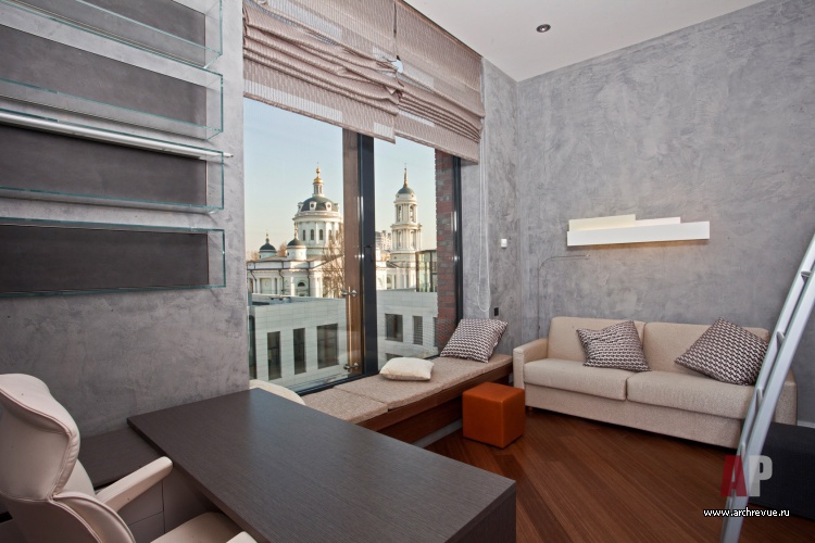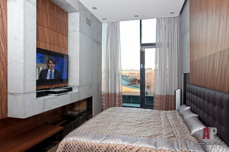 Современный интерьер квартиры строится на использовании отделочных материалов в стиле лофт: декоративных финишных покрытий «под бетон», деревянных панелей с перфорацией, напольной плитки с фактурой сланца. Все предметы мебели имеют четкие геометрические формы и близки в оттенках. Отделка встроенных шкафов «выходит» на потолок, стирая визуальную границу между стеной и потолком.