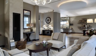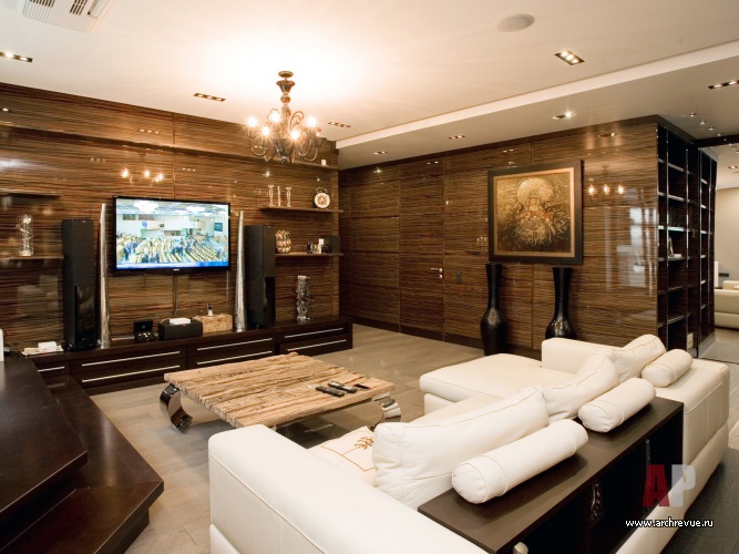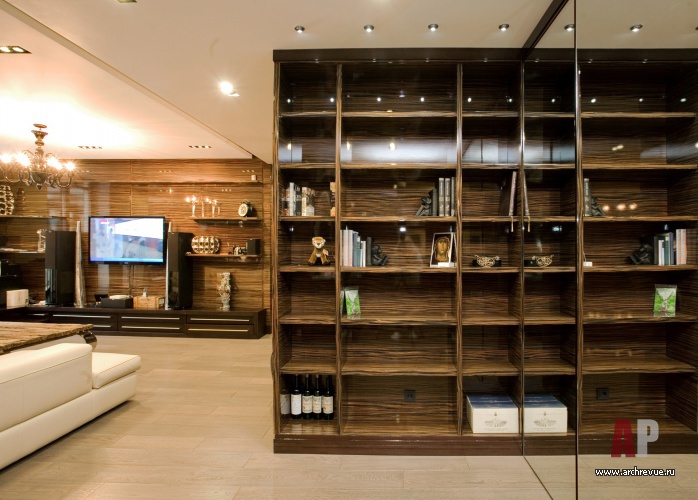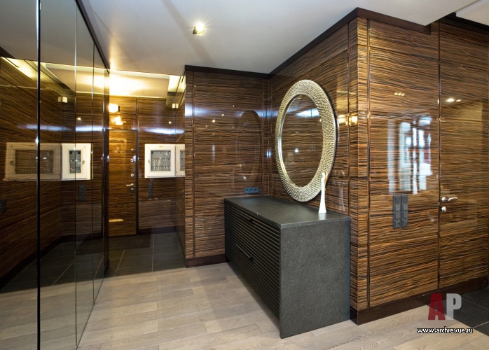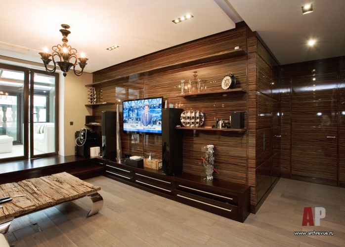 При проектировании интерьера современной квартиры для жителя мегаполиса ставка была сделана на элегантный внешний вид и фактуру древесины палисандра под глянцевым лаком. Из палисандра выполнены стеновые панели в прихожей и гостиной, фасады встроенных шкафов, стойка под ТВ. С экзотическим деревом под рояльным лаком гармонируют плинтуса и подоконники из тонированного дуба, а также ступени небольшого подиума, ведущего на застекленную кухню.