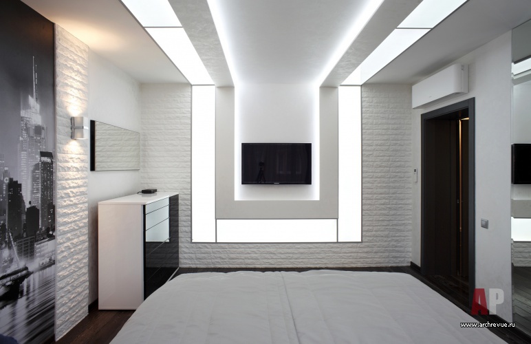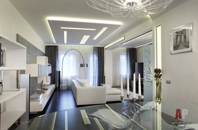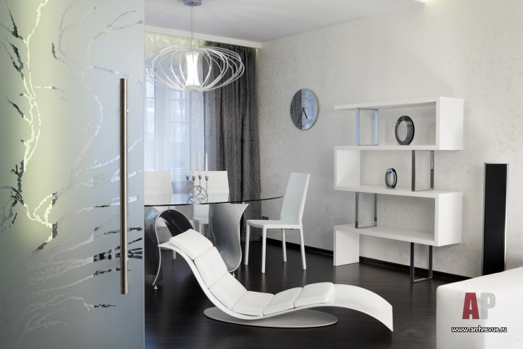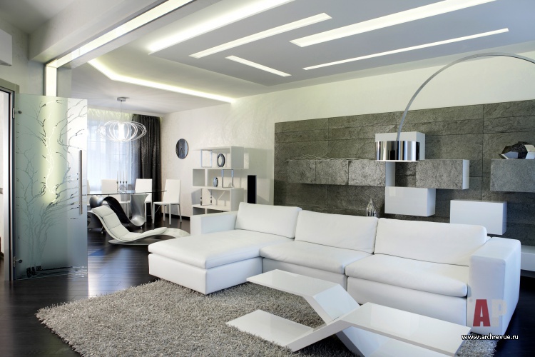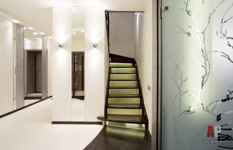 Едва ли не самую главную роль в создании образа актуального современного интерьера играют встроенные светильники и светодиодные подсветки, вмонтированные в ячейки сложного гипсокартонного потолка, забежные ступени лестницы, стену спальни. В оформлении стен использованы декоративные штукатурки с перламутром, которые визуально увеличивают объем. На контрасте с ними работают полы из темной дубовой доски, уложенной по диагонали. Белые глянцевые поверхности шкафов, стеллажей, столов придают интерьеру парадный вид. Так же как и двери из матового стекла с природным рисунком. Растительный мотив, изображенный на дверях, рифмуется с отделкой модульной системы стеллажей в гостиной панелями из натурального сланца. Декоративная брутальность в спальне подчеркивается оформлением стен белым искусственным камнем с шероховатой фактурой.