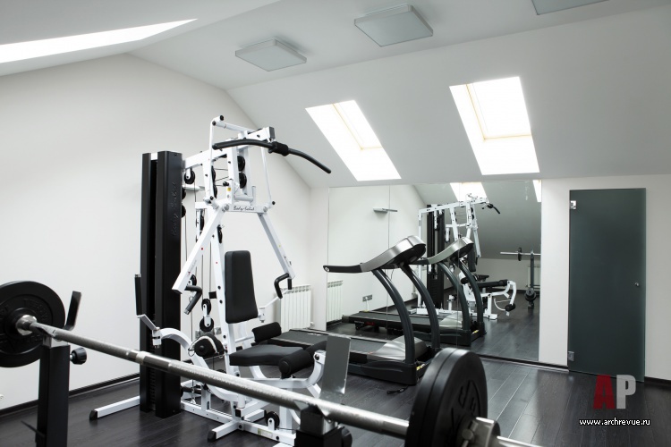 На первом этаже расположена входная зона с лестничным холлом, гостиной-столовой, изолированной кухней и гостевым санузлом. На втором этаже находятся три спальни с ванными комнатами и гардеробными. А в третьем, мансардном этаже расположилась зона отдыха и тренажерный зал.